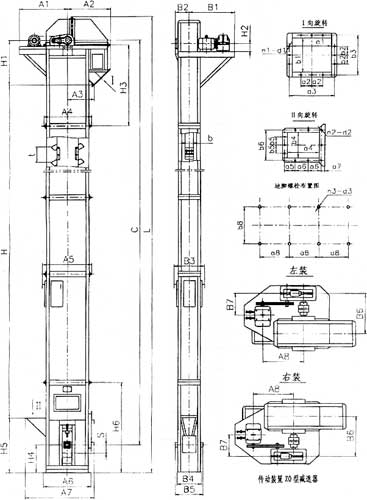 TH型斗提機(jī)外形見圖2,其尺寸見表7、驅(qū)動裝置配套及相關(guān)尺寸見表9。