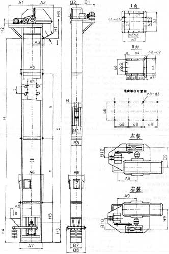 (1)傳動裝置 TD型斗提機(jī)的傳動裝置有兩種形式,分別配有YZ型減速型或ZQ(YY)型減速器。YZ型軸裝減速器直接套裝在主軸軸頭上,省去了傳動平臺、聯(lián)軸器等,使結(jié)構(gòu)緊湊,重量輕,而且其內(nèi)部帶有異型輥逆止器,逆止可靠。該減速器噪聲低,運(yùn)轉(zhuǎn)平穩(wěn),并隨主軸浮動,可消除安裝應(yīng)力。(2)TD型斗提機(jī)備有四種料斗:Q型(淺斗)、H型(弧底斗)、Zd型(中深斗)、Sd型(深斗)