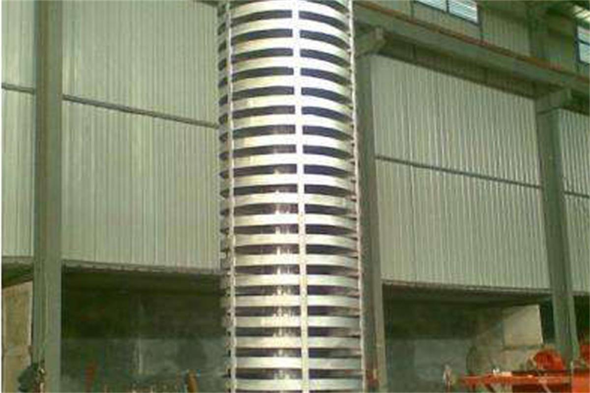 垂直振動輸送機是通過激振器強迫振動,使輸送塔作沿垂直方向的直線振動和繞鉛垂中心軸的扭動振動,兩個振動的合成,使物料朝 螺旋運動的方向斜拋,形成了物料沿螺旋槽向上的輸送過程。垂直振動輸送機是由提升槽、振動電機、減振系統(tǒng)和底座等組成。垂直振動輸送機分開槽式、封閉式兩種結構。